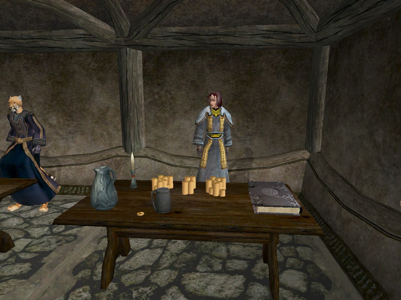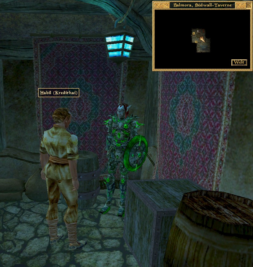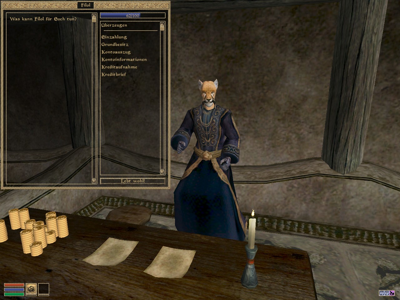 V 2.2 Nicht mehr erhältlich Es werden Banken in 5 Städten (Balmora, Sadrith Mora, Vivec, Vos, Gnisis) und 6 erwerbbare Gebäude (Balmora, Pelagiad, Suran, Caldera, Sadrith Mora, Dagon Fel, Tel Branora, Tel Aruhn) hinzugefügt. Mit der Mod. erhält MW ein Banksystem. In der Bank kann man sein Geld anlegen, Kredite aufnehmen und Kreditbriefe (Akkreditiv) kaufen. Es lassen sich in den oben genannten Orten Gebäude erwerben (und auch wieder verkaufen - allerdings banktypisch ;) die oft einen zusätzlichen Nutzen aufweisen. Sollte das Geld beim besten Willen einmal nicht ausreichen lohnt sich vielleicht ein Besuch der Diebesgilde - jedoch ... seht selbst. Für die Übersetzung der meisten Dialoge vielen Dank an madmaxx. Besitzer einer Vorgängerversion können auch nur die esp-Datei laden, die Music ist gleich geblieben. |